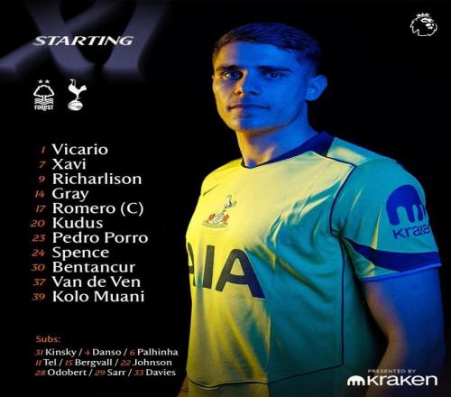 热刺首发:1-维卡里奥、17-罗梅罗、37-范德芬、23-波罗、24-斯彭斯、30-本坦库尔、14-阿奇-格雷、7-西蒙斯、39-穆阿尼、20-库杜斯、9-里沙利松