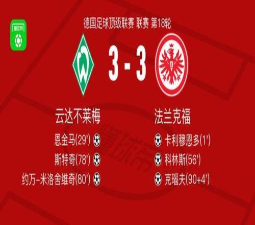 北京时间1月17日,2023-2024赛季德国足球甲级联赛第18轮,云达不莱梅主场迎战法兰克福。比赛伊始,法兰克福迅速打破僵局,卡利穆恩多接纳撒尼尔-布朗助攻后破门得分。随后,云达不莱梅展开反击,菅原由势送出精准传球,恩金马成功将球送入对方球门,为球队扳平比分。 进入下半场,法兰克福再次取得领先,沙伊比助攻科林斯破门。此后,云达不莱梅持续施压,姆班古拉送出关键助攻,斯特奇冷静推射建功,再度缩小分差。紧接着,施密德策动进攻,约万-米洛舍维奇抓住机会完成破门,帮助主队首次反超比分。 比赛临近结束,双方争夺愈发激烈。补时阶段,法兰克福发动最后一次攻势,阿迈穆尼-埃奇古亚布送出绝平助攻,克瑙夫完成破门。最终全场比赛结束,双方以3比3握手言和。