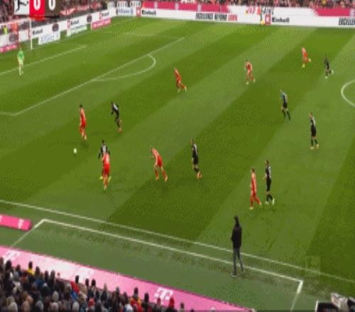 第22分钟,帕夫洛维奇弧顶处断球斜塞,卡尔不停球直接兜射远角,皮球不偏不倚直接击中了立柱;第28分钟,迪亚斯中路直塞打穿防守,凯恩反越位切入禁区低射滑门而过;第35分钟,比朔夫外围起脚远射,皮球折射后再次击中门柱!在连续强压的下,拜仁在半场结束前成功扳平,第44分钟,金玟哉过了中圈后长传送入禁区,迪亚斯在身体失去重心前将球回做,格雷罗反应迅速立马跟进抽射破门,1:1!